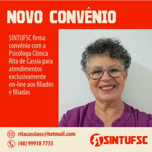 O SINTUFSC firmou mais um convênio com a terceira profissional para atendimento em saúde mental: a psicóloga clínica Rita de Cássia. O convênio passa a valer a partir de dezembro.