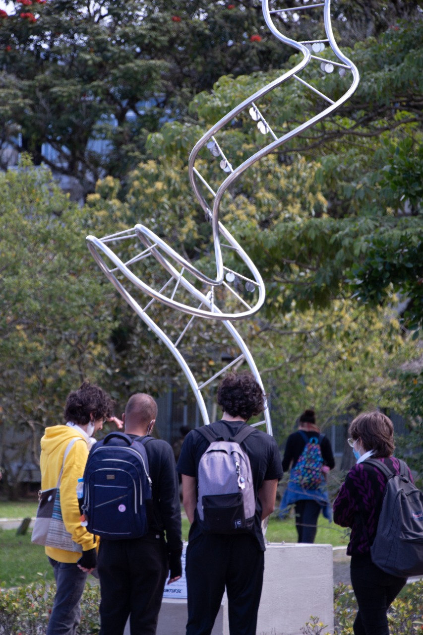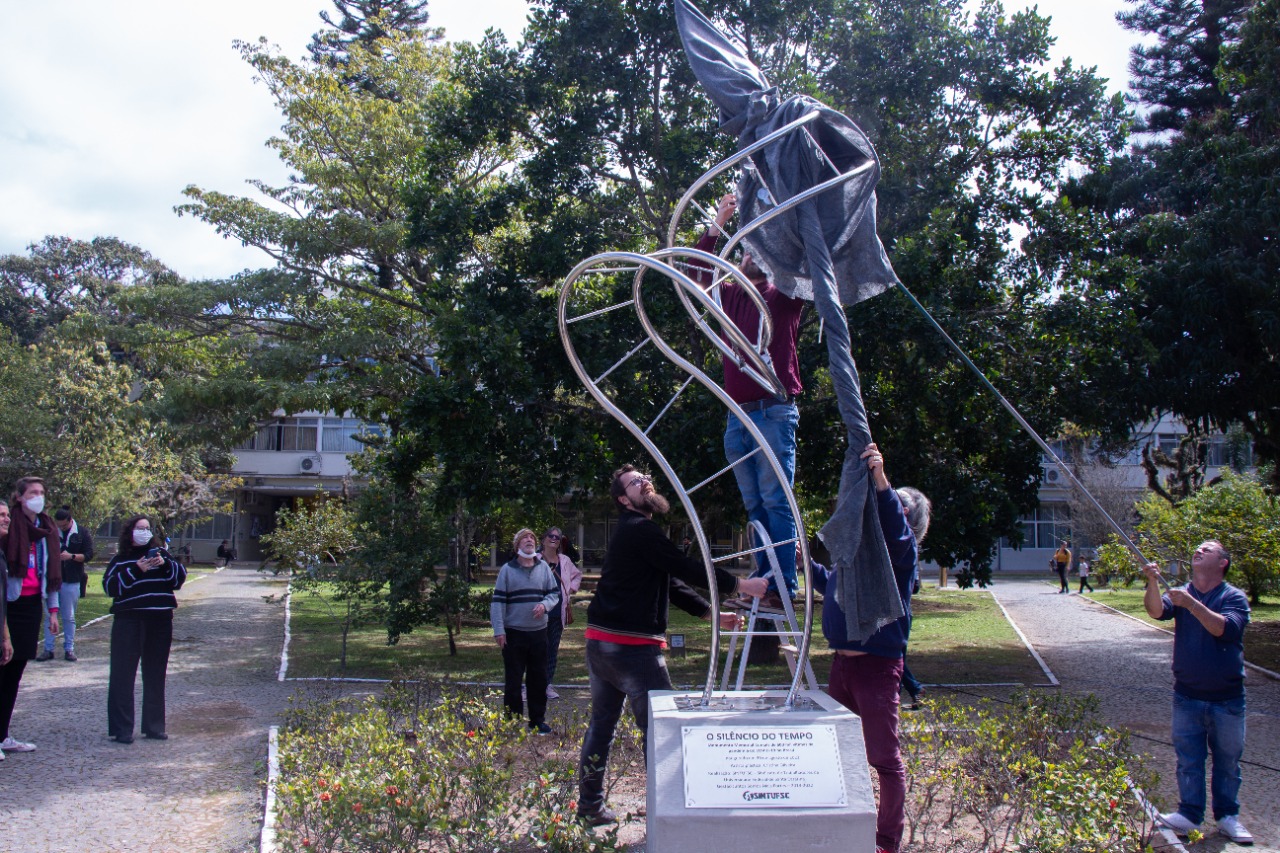 A obra, intitulada “O silêncio do tempo”, foi selecionada em edital público e elaborada pela artista plástica Cristina Oliveira, com o objetivo de registrar no espaço físico da universidade todo o sentimento de luto, perda, respeito e saudade, bem como valorizar a participação imprescindível da ciência e da universidade na superação de toda essa dor, apesar do atrapalho do governo Bolsonaro.